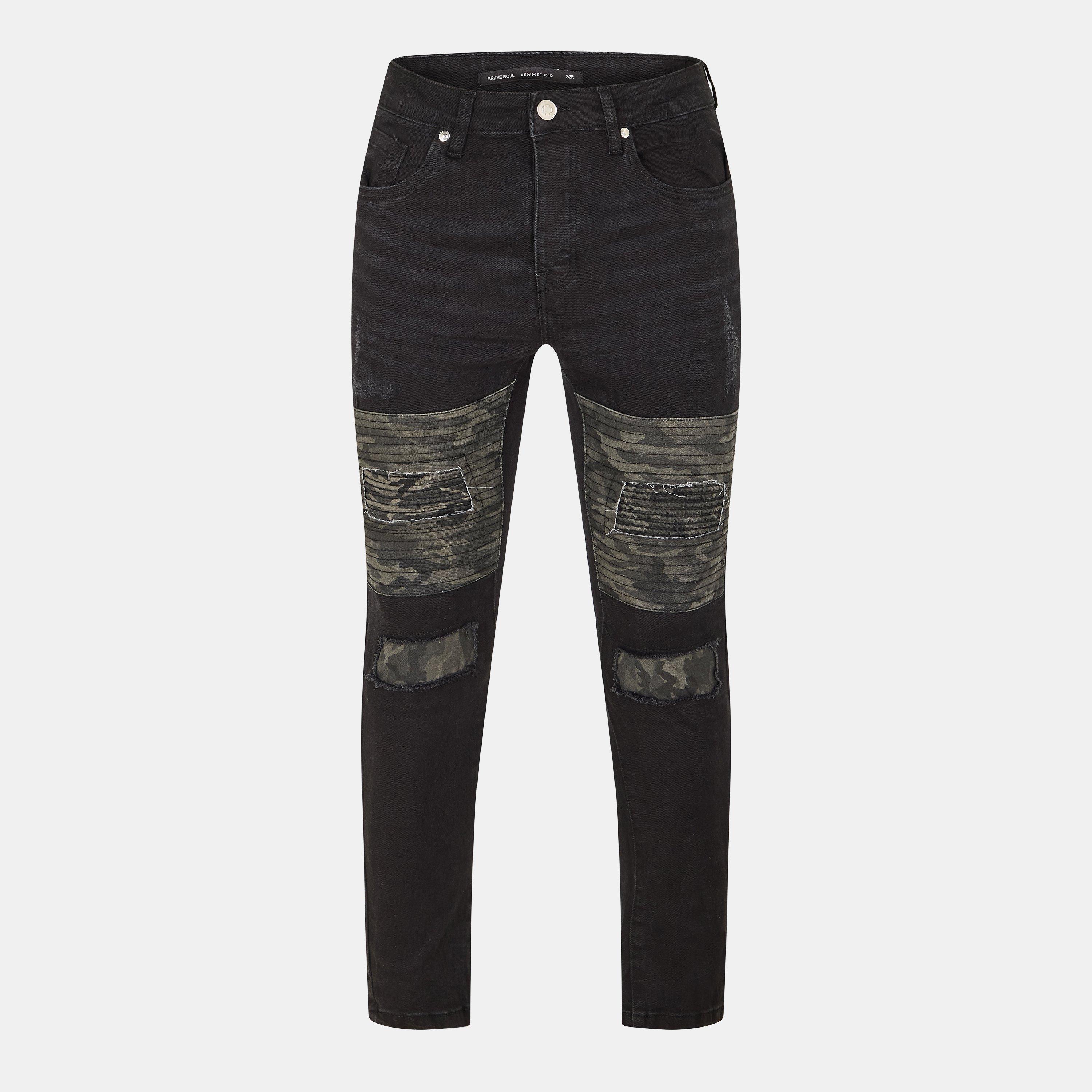 Brave Soul Mens Charcoal Wash Biker Jean with Cut Out Knee Details