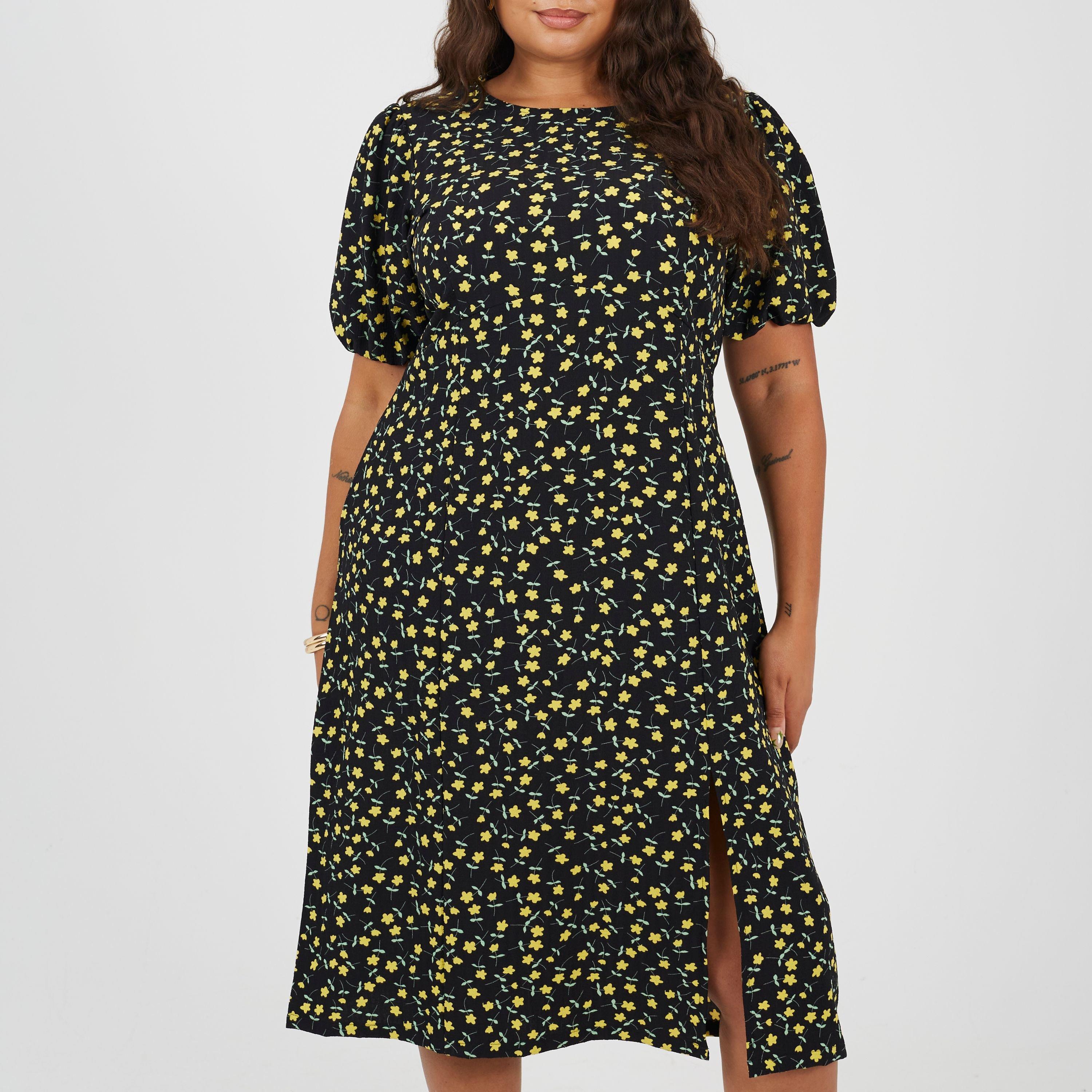 Brave Soul Plus Size Puffy Sleeve Floral Midi Dress with Puff Sleeves