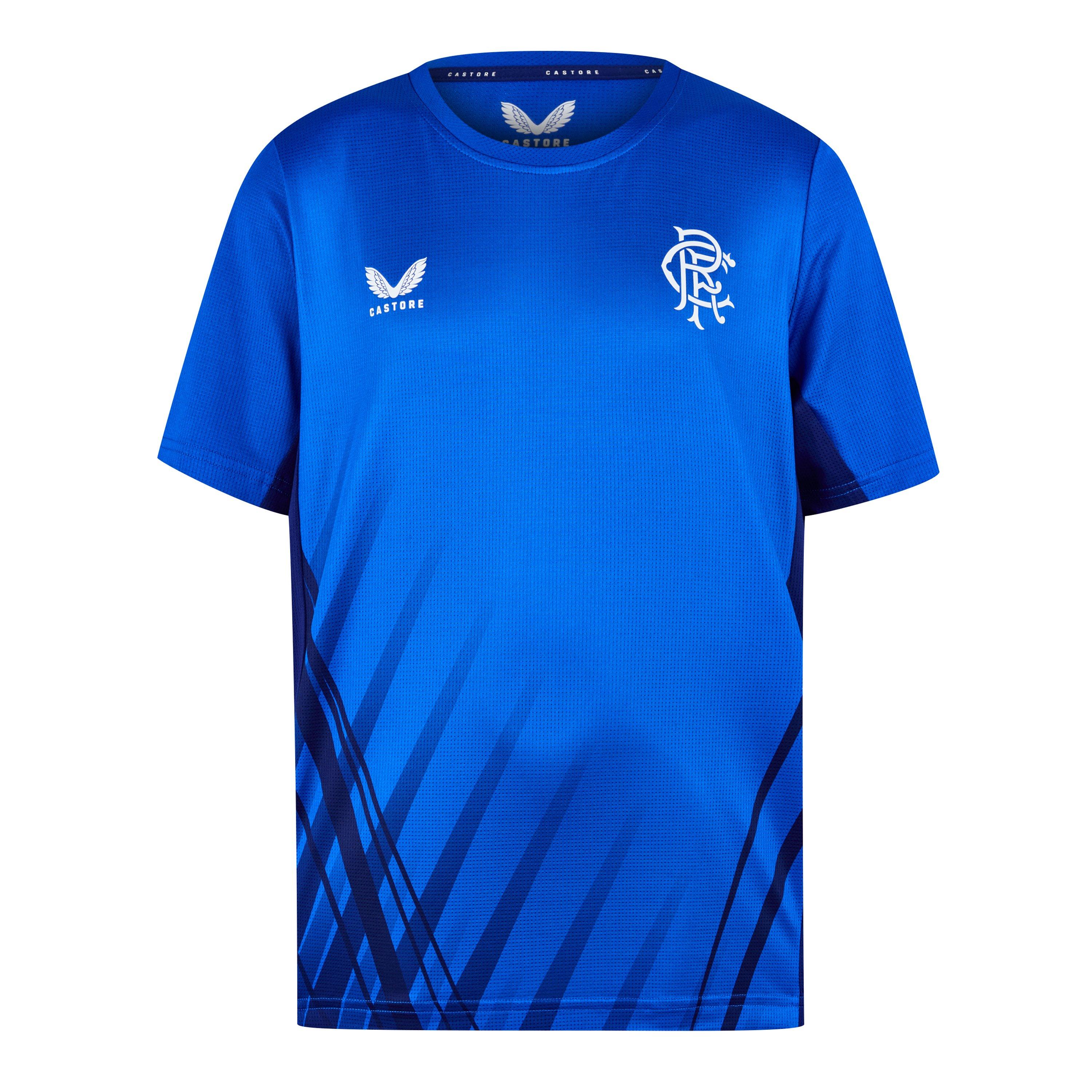 Laissez votre futur footballeur fouler le terrain avec fierté et passion dans le T-shirt d'entraînement Castore Rangers. Avec le logo signature sur la poitrine pour une finition distinctive. Que ce soit en encourageant depuis les gradins ou en s'échauffant pour un match, ce haut est le compagnon sportif parfait pour votre jeune joueur.