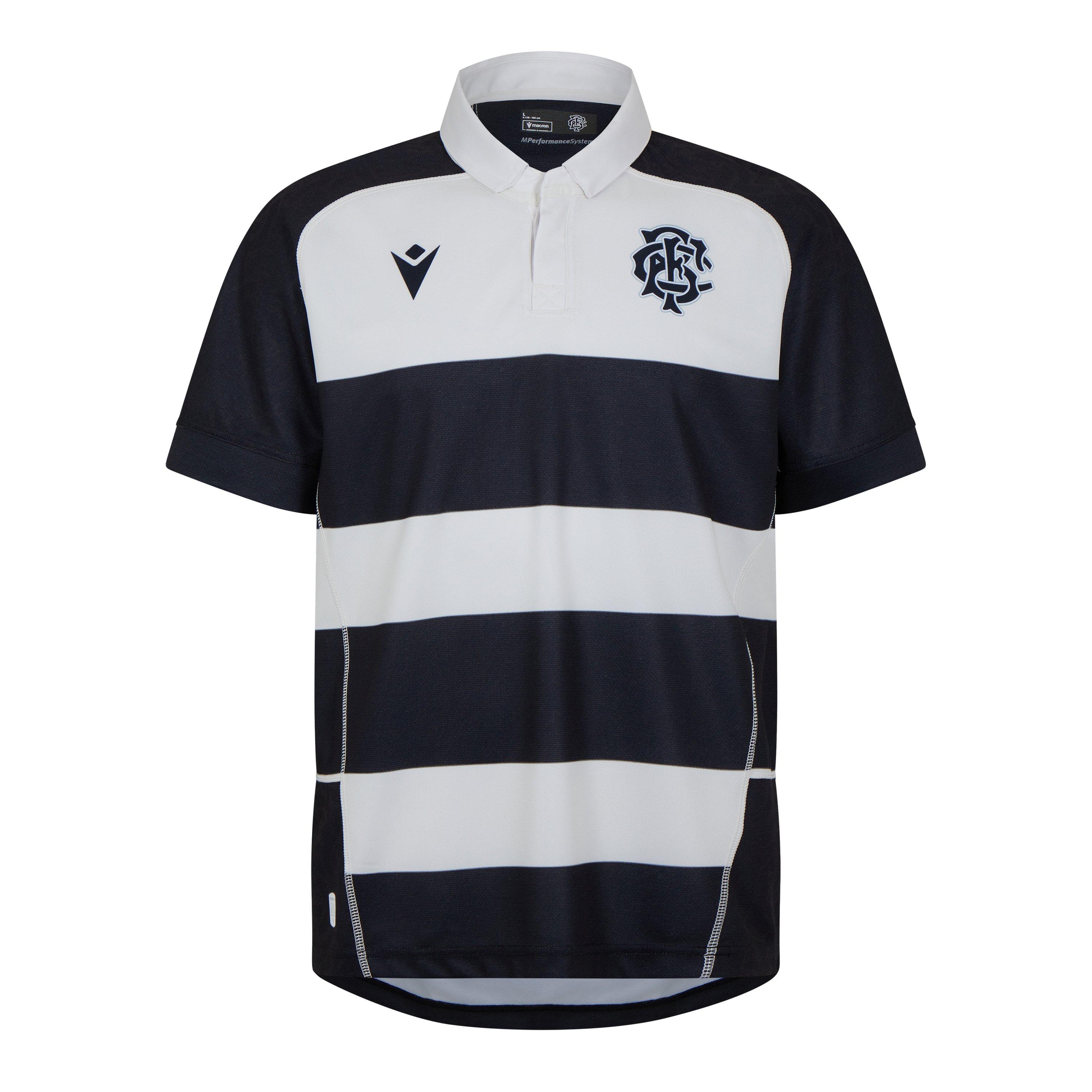 Combattez comme un barbare dans ce maillot de réplique domicile Macron Barbarians 24/25, conçu pour des performances optimales. Les célèbres rayures noires et blanches rappellent l'histoire légendaire du club, tandis que le motif de blason en relief sur les épaules ajoute une touche de sophistication à la marque. Avec une coupe décontractée pour un confort ultime, ce maillot se démarque facilement que vous soyez sur le terrain ou en train de vous détendre en dehors.