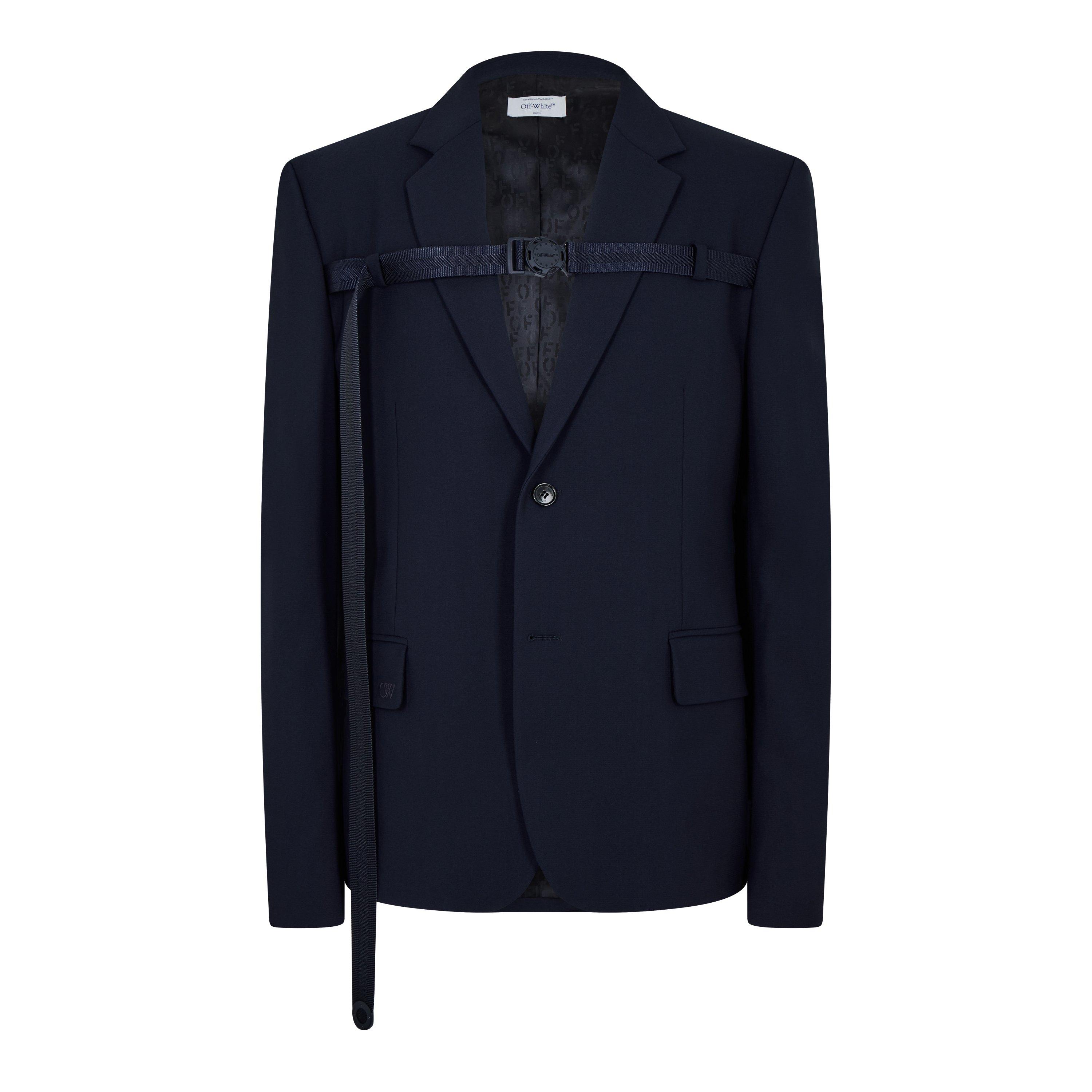 Le blazer contemporain d'Off-White présente une coupe structurée et des lignes épurées conçues pour des occasions spéciales. Les textures des tissus ajoutent de la profondeur.