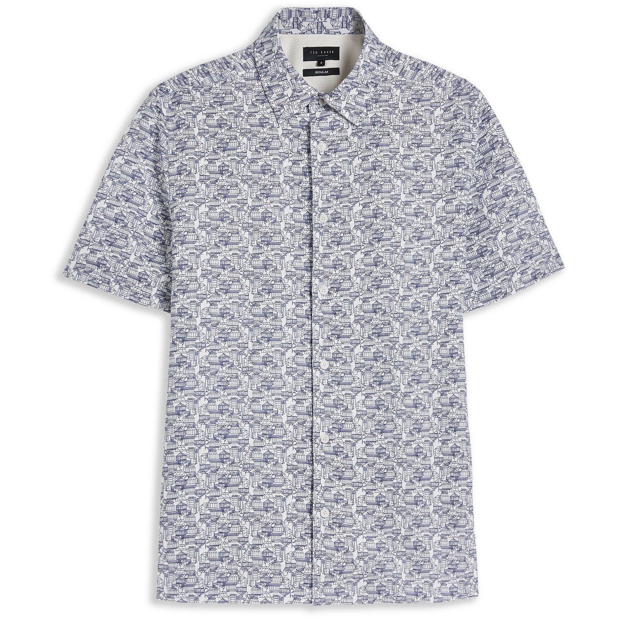 Rehaussez votre collection quotidienne avec la chemise à manches courtes Laughy de Ted Baker. Dotée d'un imprimé graphique, elle est destinée à devenir votre nouveau favori. Fabriquée à partir d'un mélange léger de lyocell et coupée dans une coupe régulière, cette chemise pour hommes présente un col traditionnel encadré par des manches courtes classiques et une ourlet droit. Une patte de boutonnage centrale assure un ajustement confortable et sécurisé.