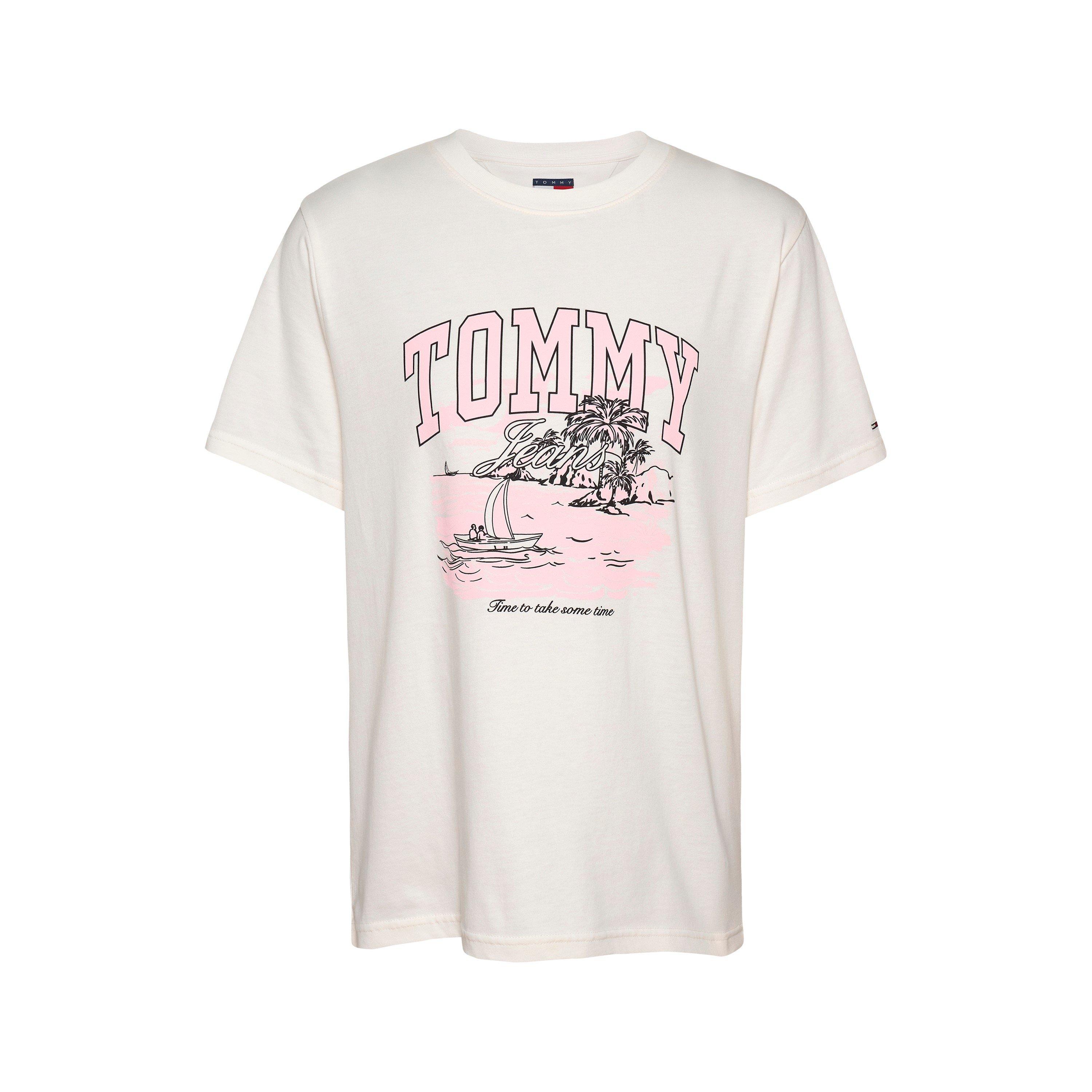Le T-shirt Tommy Jeans Tropics Tonal Pattern est conçu avec un col rond et présente un design tonal tropique sur le devant.